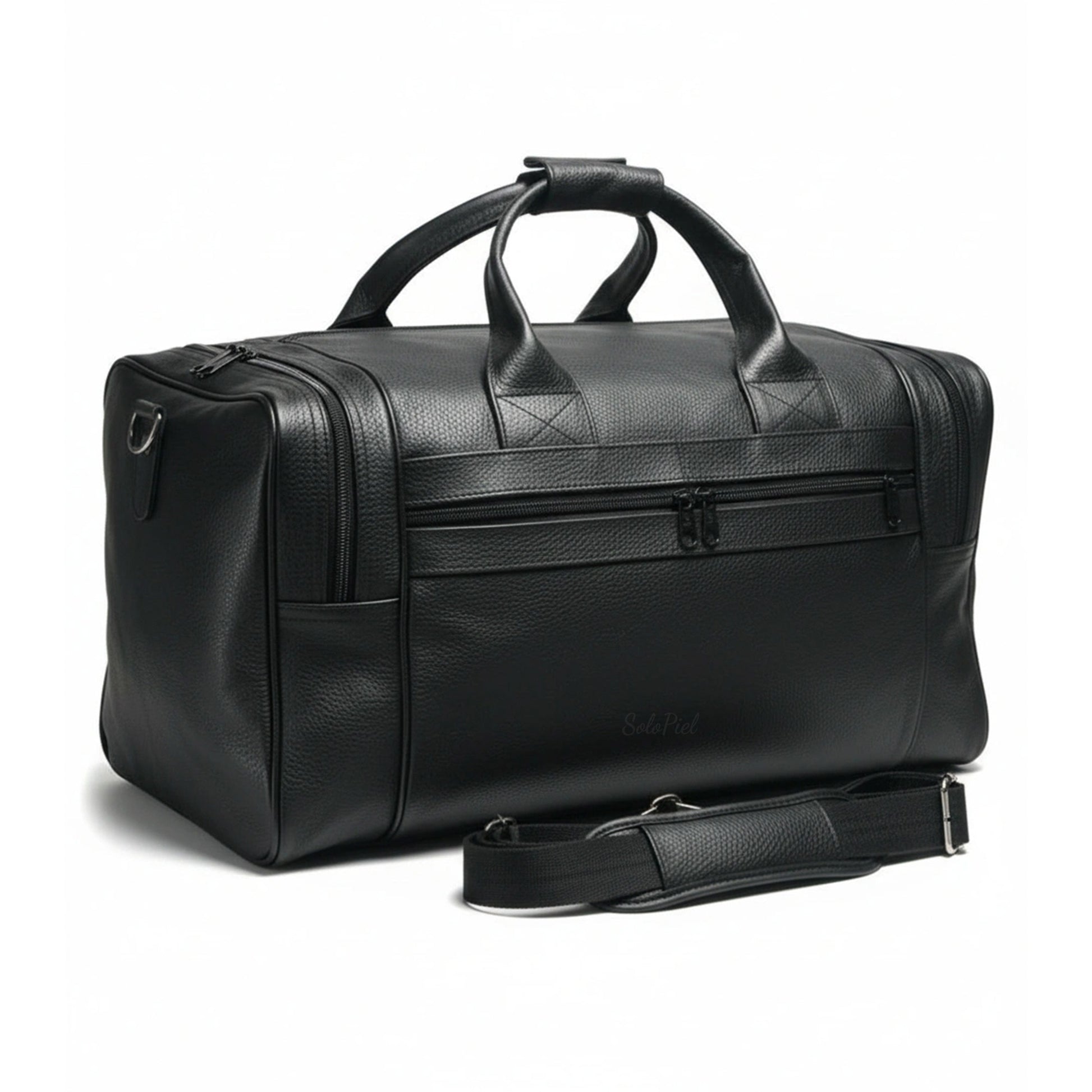 Fabricado en piel de res entera. Cuenta con 2 carteras laterales con cierre y 2 frontales. Hombrera ajustable de piel y herrajes metálicos cromados.